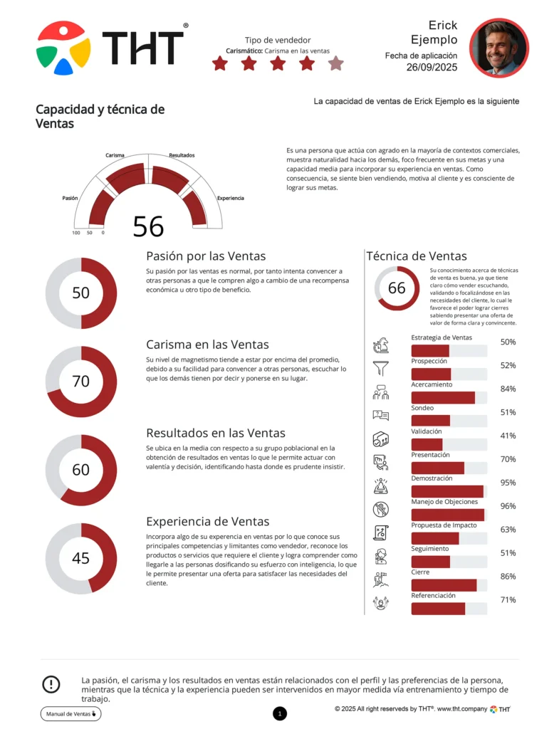 Mide las competencias clave que diferencian a un vendedor exitoso de uno promedio. Evalúa pasión, carisma, disciplina, resultados, técnica y experiencia, identificando fortalezas y brechas que impactan directamente en el desempeño comercial.