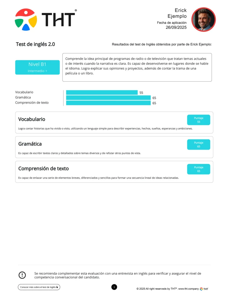 Evalúa de manera rápida y confiable el dominio real del inglés en vocabulario, gramática y comprensión de lectura. Ubica a cada persona en los niveles internacionales del Marco Común Europeo (A1–C1), asegurando una medición precisa y comparable.