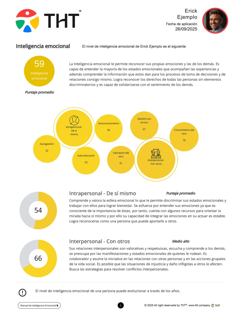 Este test evalúa la Inteligencia intrapersonal (autoconocimiento, autovaloración, autogestión) e interpersonal (empatía, valoración del otro, gestión de relaciones) que permite obtener una radiografía de como maneja las emociones propias y de otros.