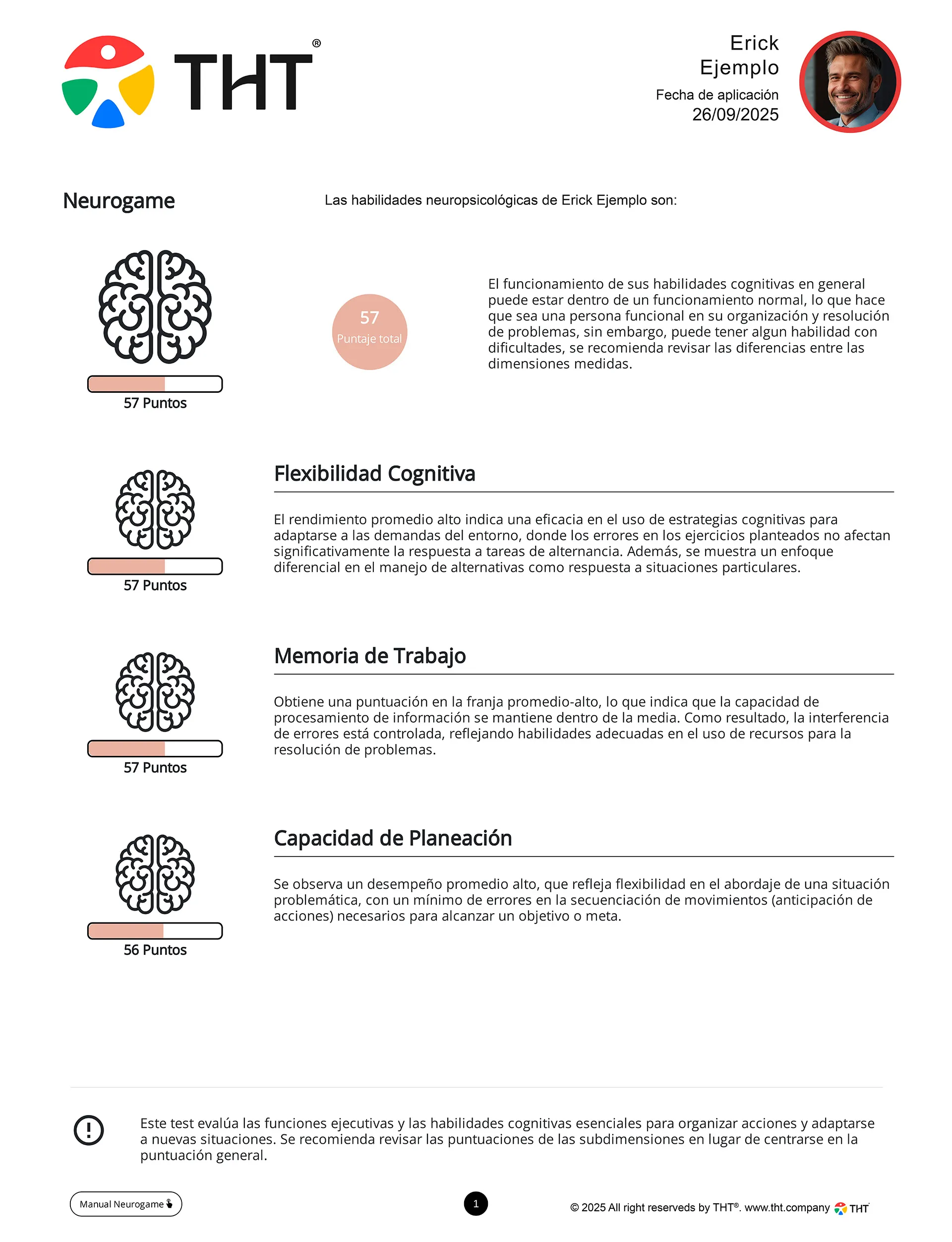 Este test gamificado evalúa funciones ejecutivas clave como flexibilidad, memoria de trabajo y planeación a través de varios ejercicios prácticos diseñados por neuropsicólogos, lo que permite detectar áreas de mejora, facilitando intervenciones personalizadas para potenciar el desarrollo personal y profesional.